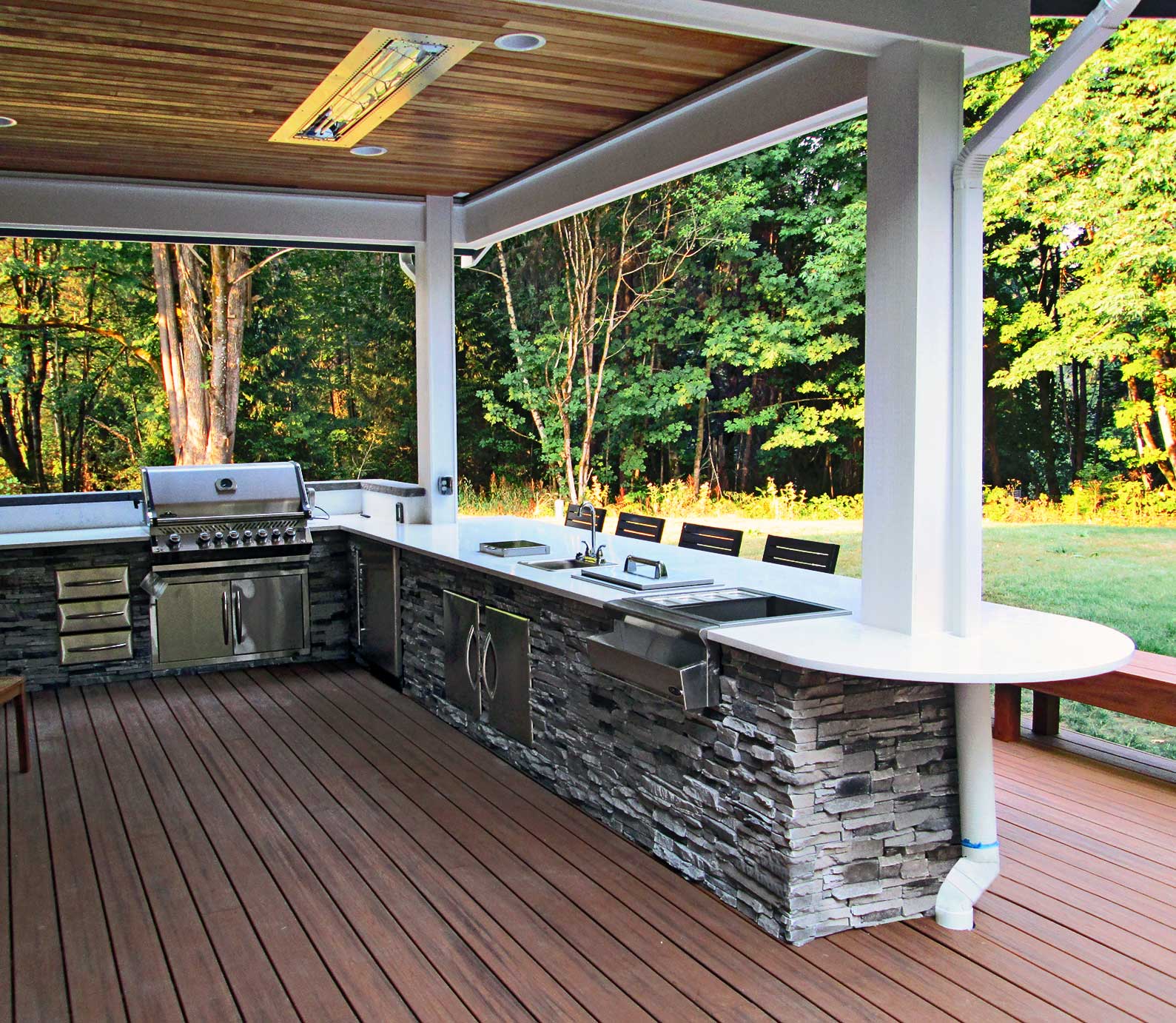 This back patio remodel was done to create a more open and spacious back deck for hosting guests as well as an enclosed outdoor kitchenette & dining area.